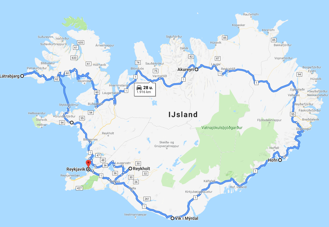 Van 12 tot en met 26 augustus gaan we naar IJsland, waar we een ‘rondje’ om het eiland gaan doen. Hieronder vind je een kaart van de route.